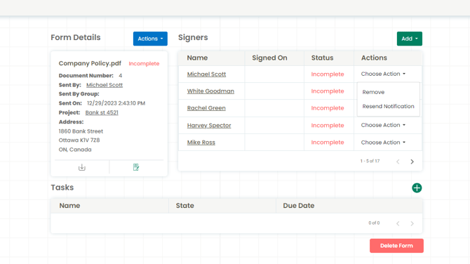 Step 5: You will now have the Form Show up on the All Forms page where you can monitor who has signed off on the document, and resend notifications if needed.