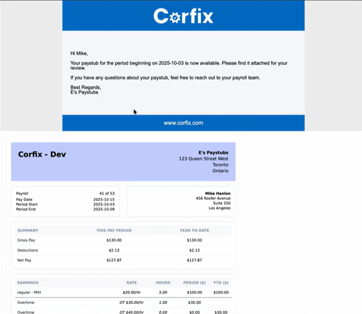 Corfix now makes it easier for your team to access paystubs. Employees can automatically receive their paystub by email one day before payday — no passwords required.