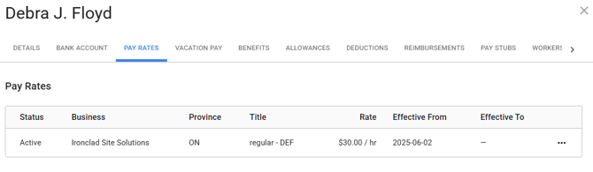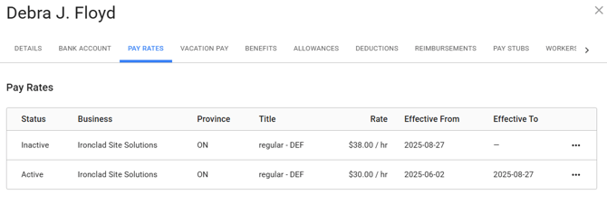 When you update the Regular Pay Rate Override in a worker’s profile, the system will automatically close out the current pay rate record in Payroll. The Effective To Date will be timestamped, and a new pay rate entry will be created with the updated amount.