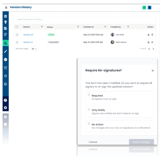 With this release, you can easily view and manage form changes by reviewing and comparing previous PDF versions. Admins can also select what workflow they want for form changes: re-sign (current signers are all required to re-sign), prompt for re-sign (user can select if re-signing is needed), notification only (all signers get notice but no re-sign needed), or none.