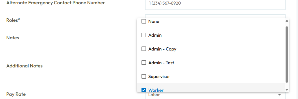 3. Then select the dropdown for the Roles, and select the Role that should apply to this Worker.