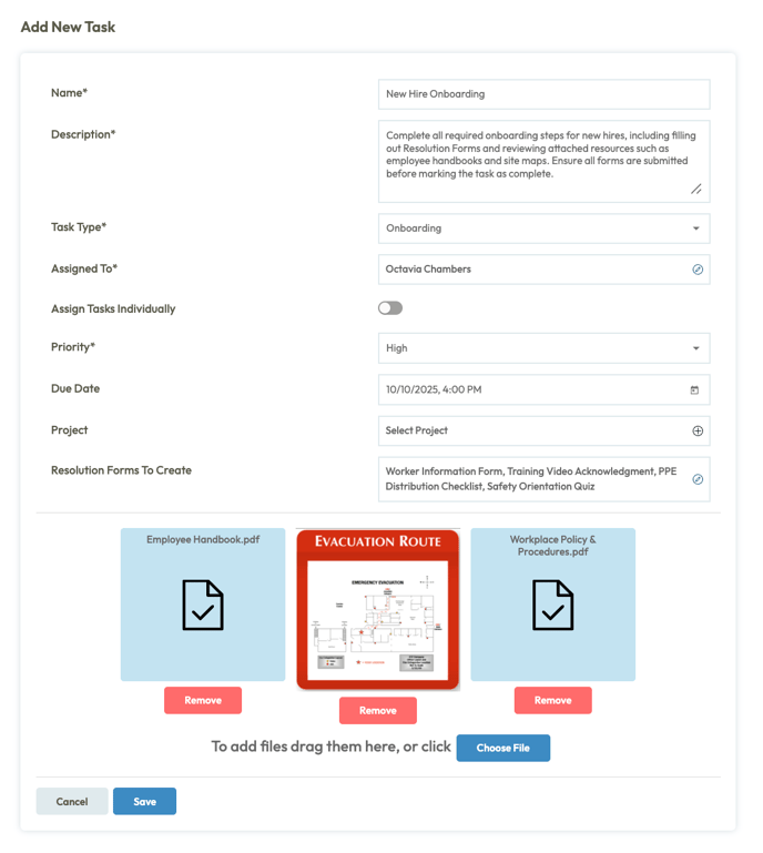 Once saved, the onboarding task cannot be completed until all attached Resolution Forms are filled out and submitted.